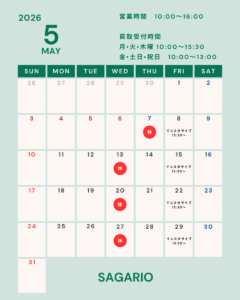 なお、5月は7日(木)、13日(水)、20日(水)、27日(水)が店休日となります。